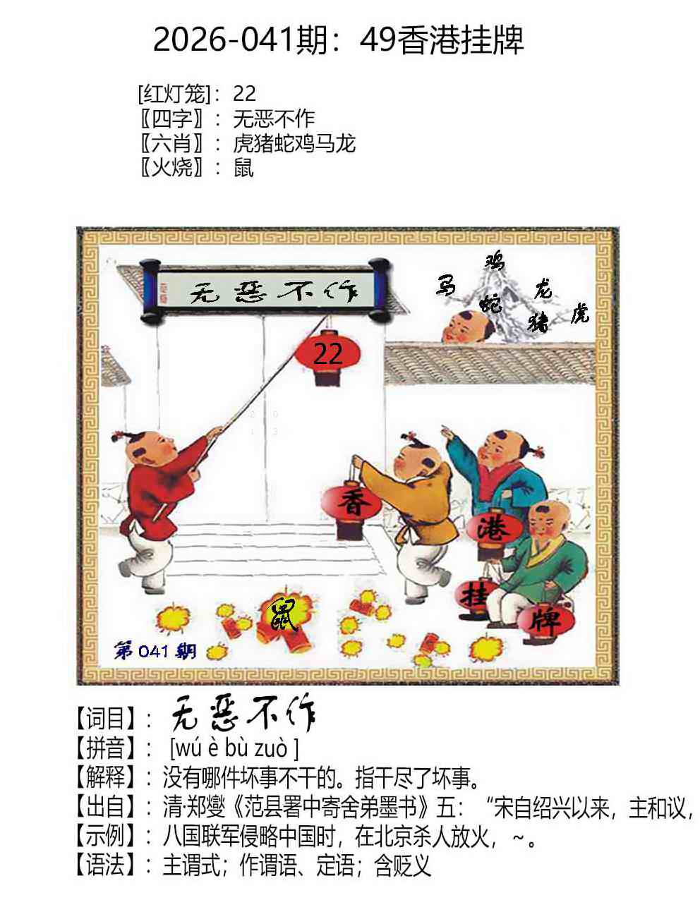041期香港挂牌成语:【无恶不作】